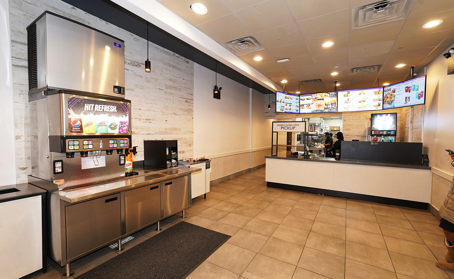 This space features sleek exterior and vibrant artwork and decor throughout the dining area which accommodates seating for 28 guests and kiosks for customer ease.